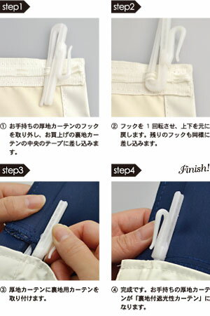 お手持ちの厚地カーテンのフックを取り外し、お買上げの裏地カーテンの中央のテープに差し込みます。