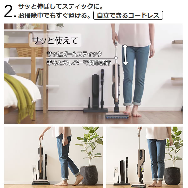 掃除中でもすぐ置ける◆さまざまな床のごみを吸う「パワフルスマートヘッド」◆ 主な仕様 ◆集じん方式サイクロン式集じん容積0.2L電池リチウムイオン電池(内蔵)連続使用時間強:約8分標準:約40分充電時間約3.5時間本体質量(標準質量)2.3kg(1.8kg)本体寸法(長さ×幅×高さ)スティック時:230×255×785〜1,015mmハンディ時:690×95×160mm付属品伸縮曲がるブラシ吸口/ふとん用吸口/すき間用吸口/充電台/お手入れブラシ