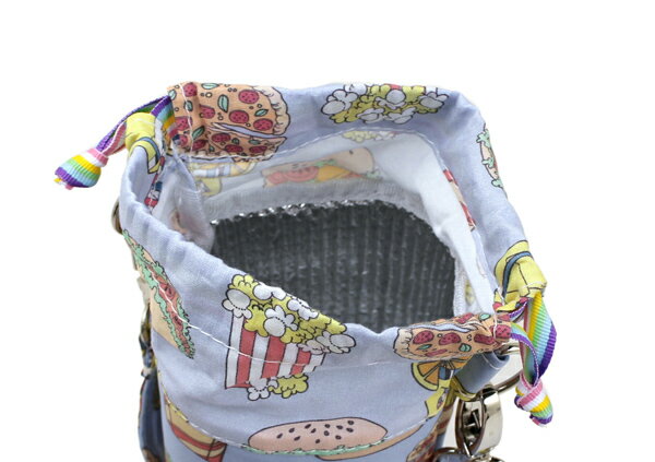 取り外し可能なショルダーストラップ付き ペットボトルケース 【BU.UNICORN】(ブルー フード柄) 表面はラミネート加工。